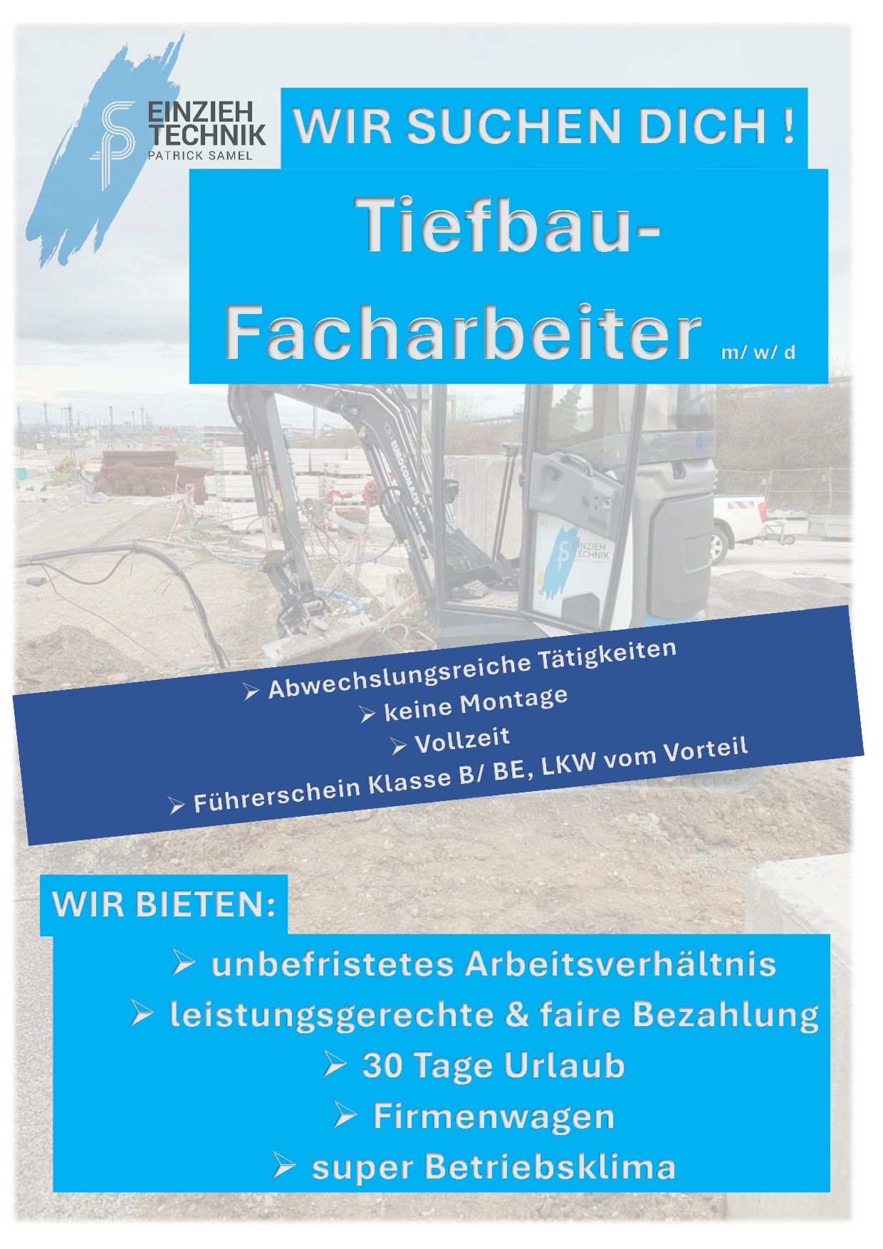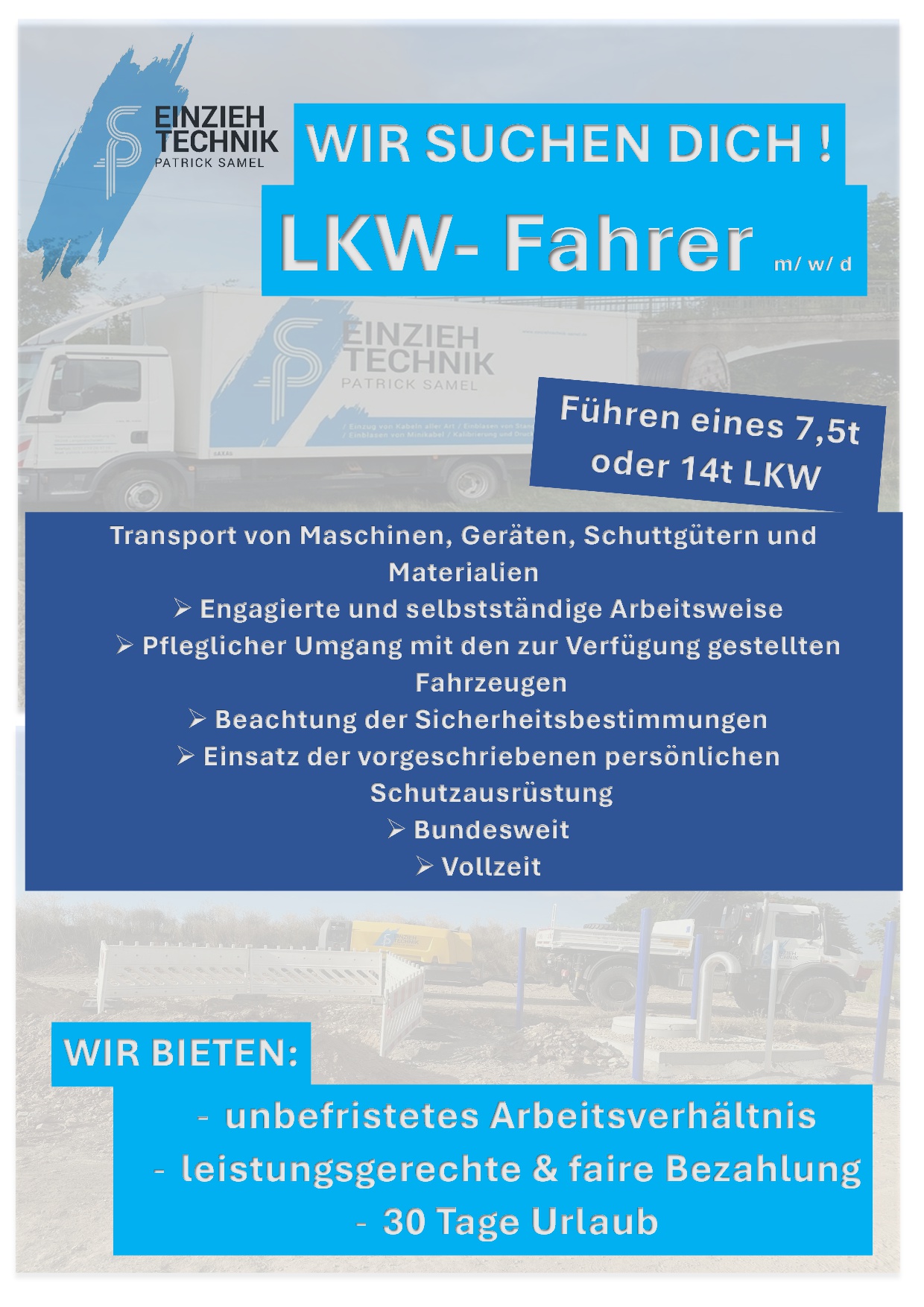 Wir, die Einziehtechnik Patrick Samel GmbH, sind ein mittelständisches Unternehmen mit einem gesunden Wachstum, welches sich seit mehr als 5 Jahren ununterbrochen abzeichnet. Unsere 2018 gegründete Firma arbeitet im Bereich Verlegung, Einziehen und Rückbau von Kabel aller Art. Kalibrierung und Druckprüfungen von Kabelschutzrohren. Ein- und Beiblasen von Kabel oder Rohren sowie Transporte von Kabelrollen und betreut Kunden im gesamten Bundesgebiet. Zu unseren Kernkompetenzen gehören die kontinuierliche Fortbildung von Mitarbeitern, sowie die fachgerechte Ausführung aller Arbeiten für unseren Auftraggebern. Zur Verstärkung unseres Teams suchen wir motivierte Mitarbeiter.